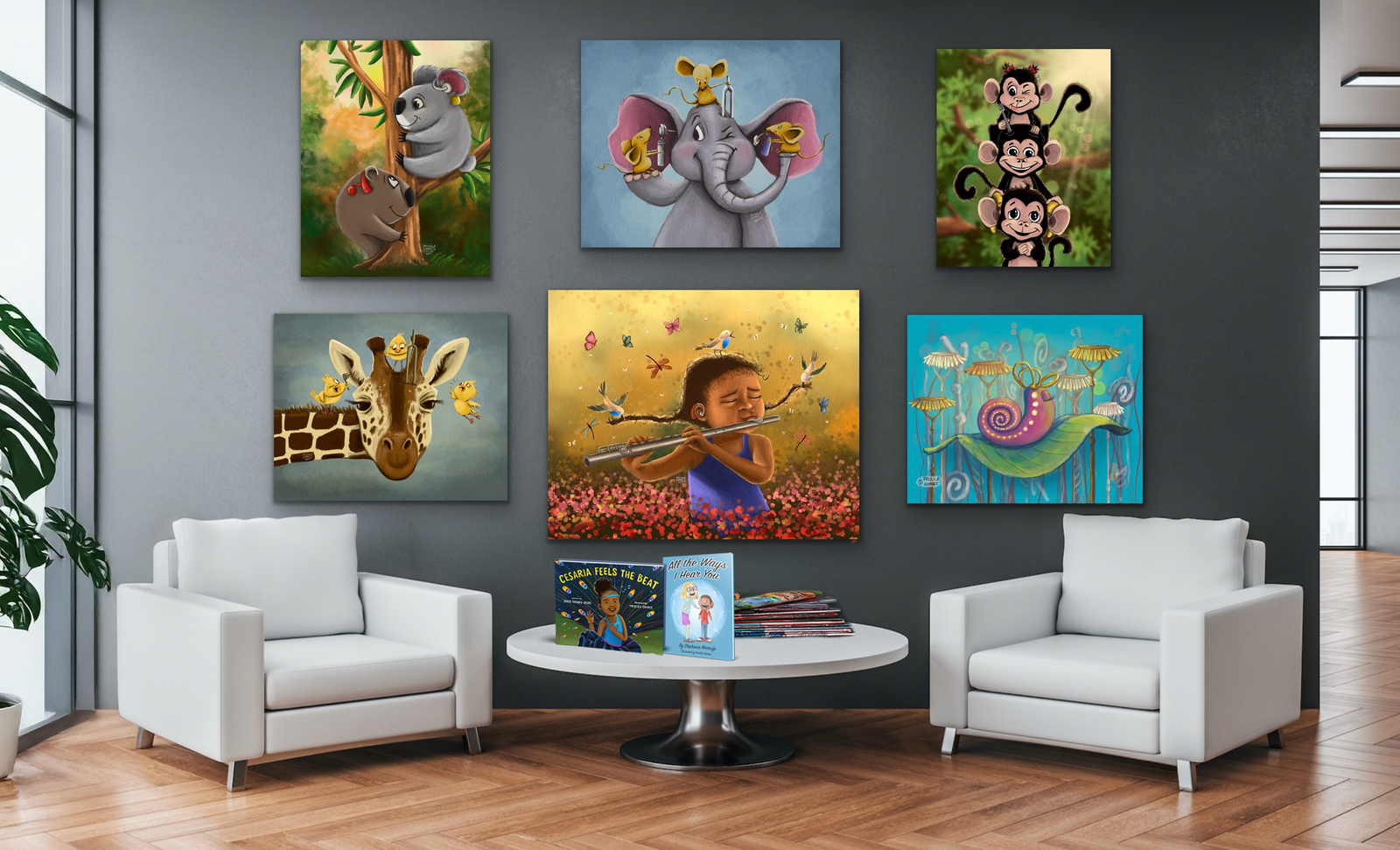 From framed illustrations to canvas paintings, 3D sculptures, installations, and murals, I tailor each piece to reflect the mission and values of your practice.