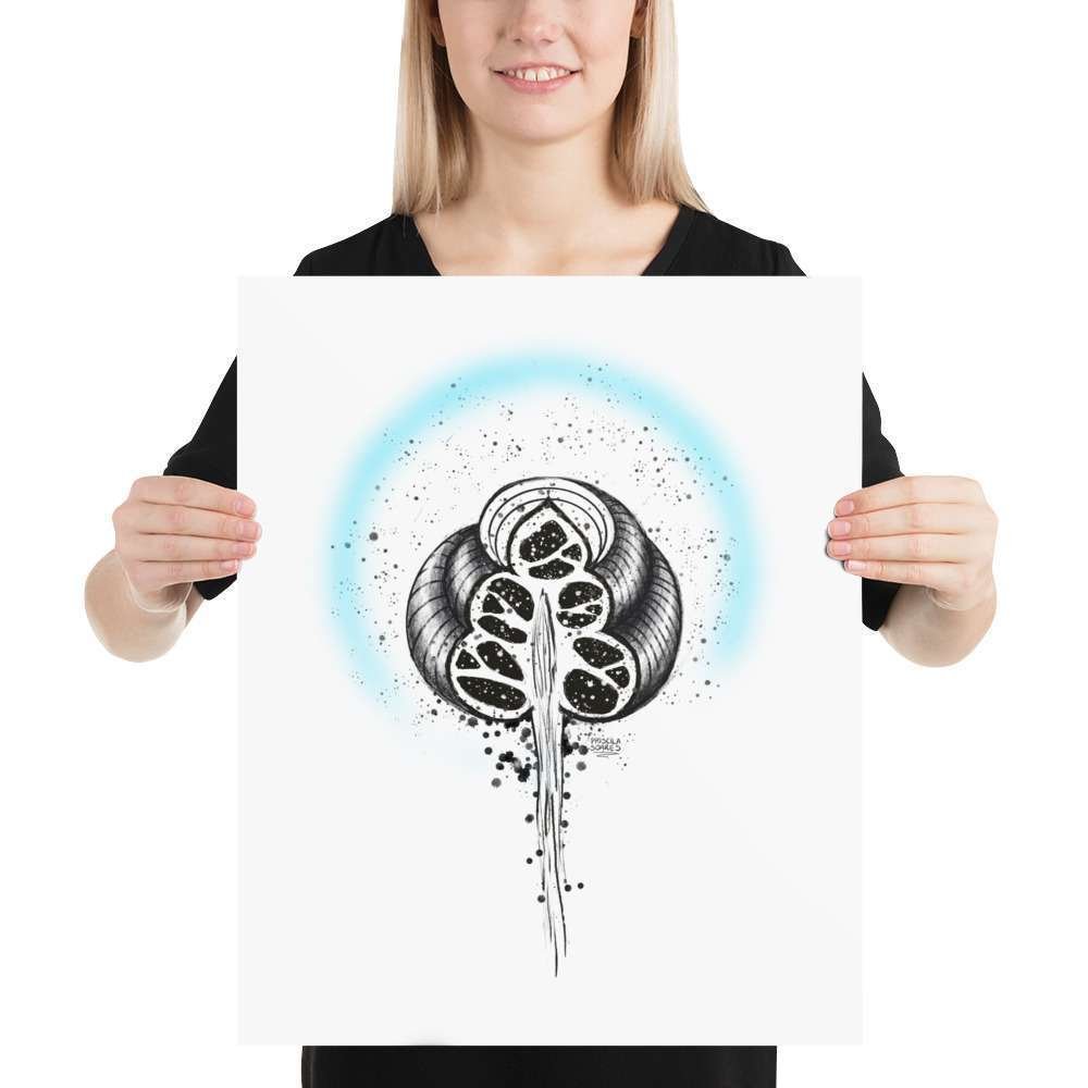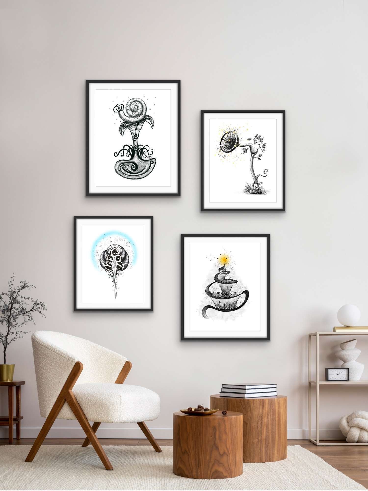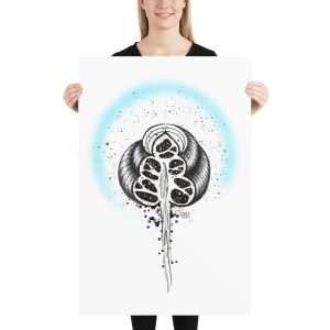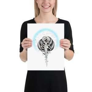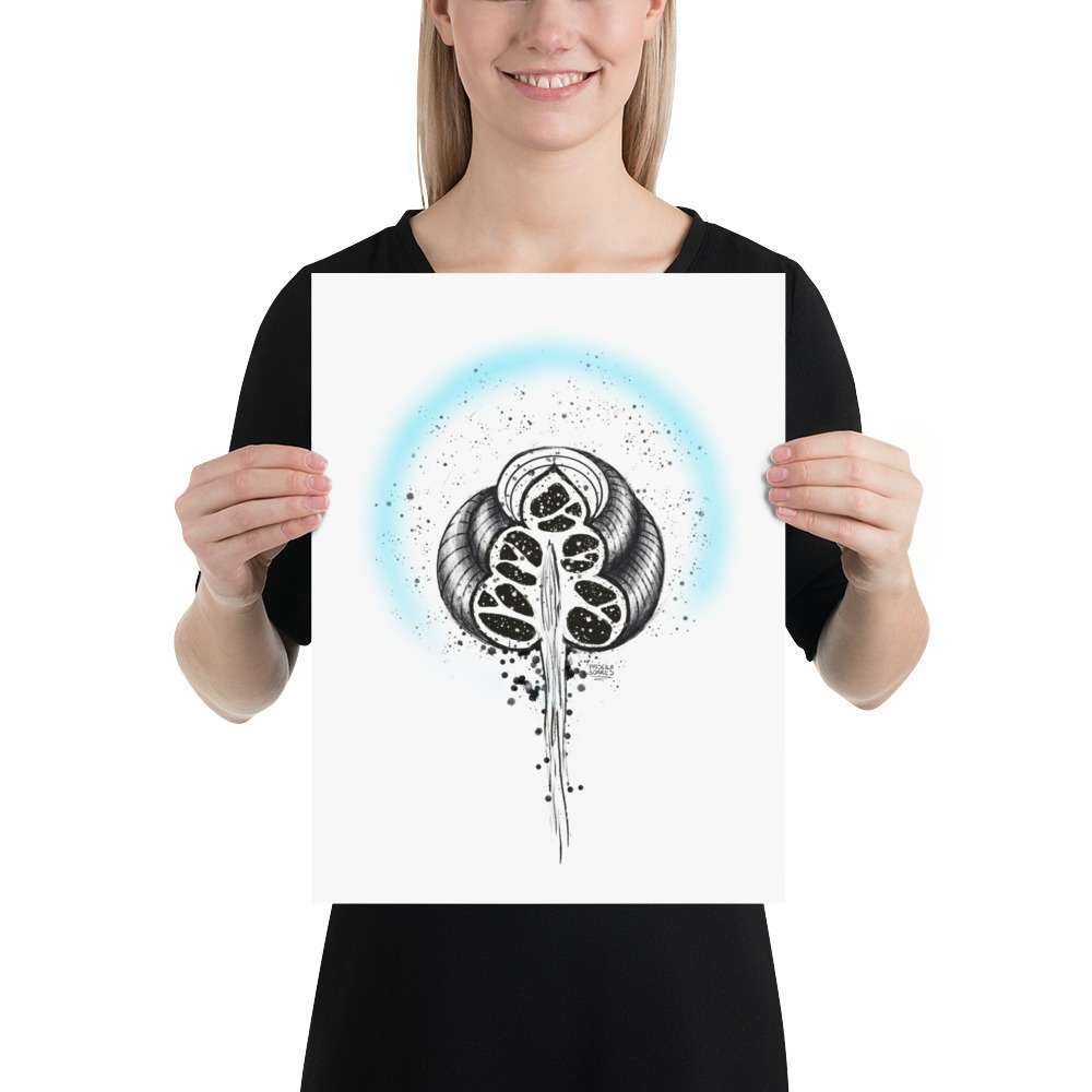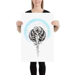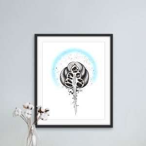 This illustration portrays the intricate inner structure of a cochlea, reimagined as a delicate flower. Rendered in black and white with fine 6B pencil strokes, the cochlear spirals form the soft petals, while the central core transforms into the flower’s heart. Adding a subtle vibrancy, a gentle blue aura radiates around the design, symbolizing energy, hearing, and connection. This blend of anatomy and organic beauty offers a thoughtful and artistic perspective, perfect for audiologists and ear health professionals who appreciate the elegance of their work.