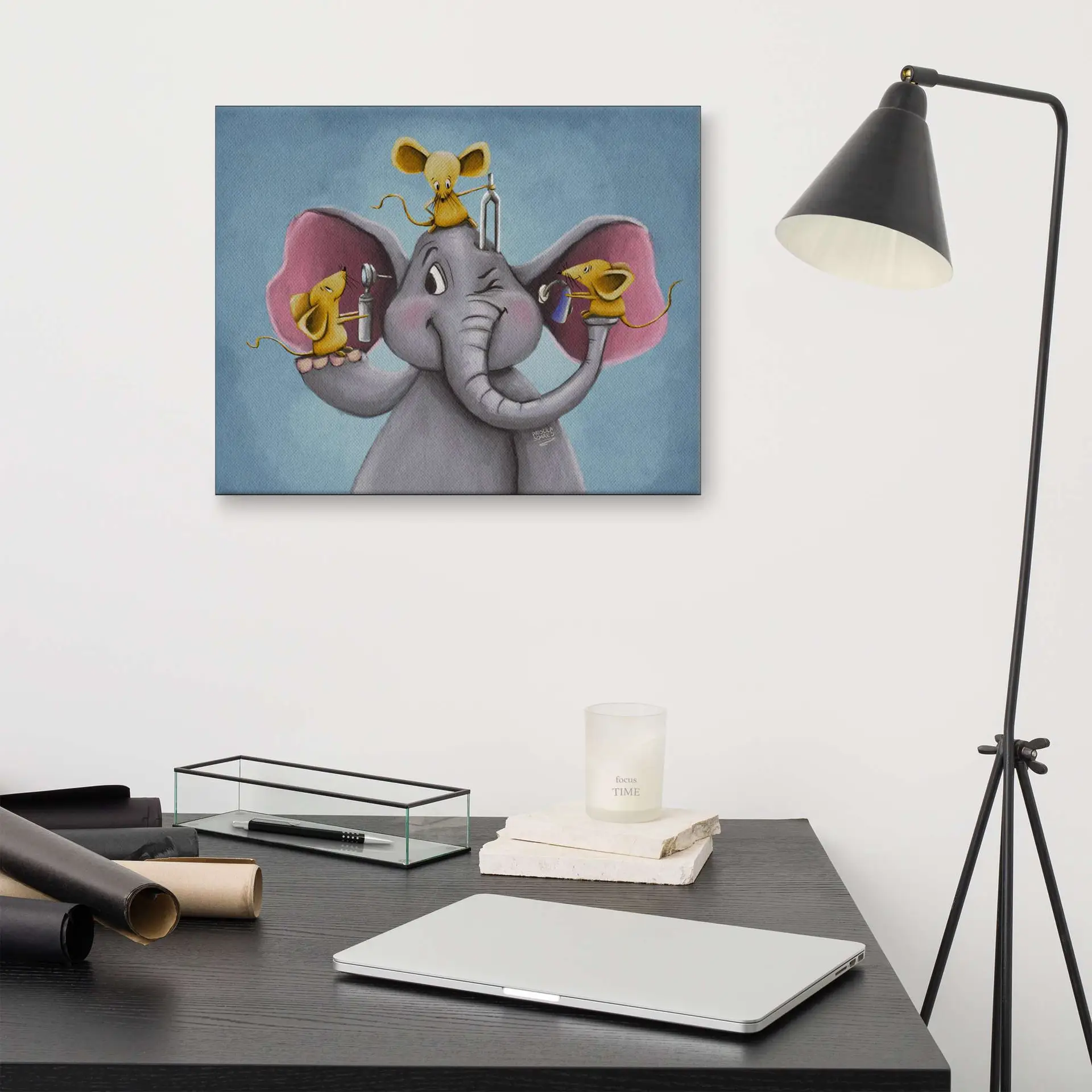 These adorable three little mice are hard at work checking the elephant’s hearing. One uses an otoscope, another holds a tuning fork, and the third fits a shiny new hearing aid! This whimsical canvas print is a playful reminder of the importance of hearing health.