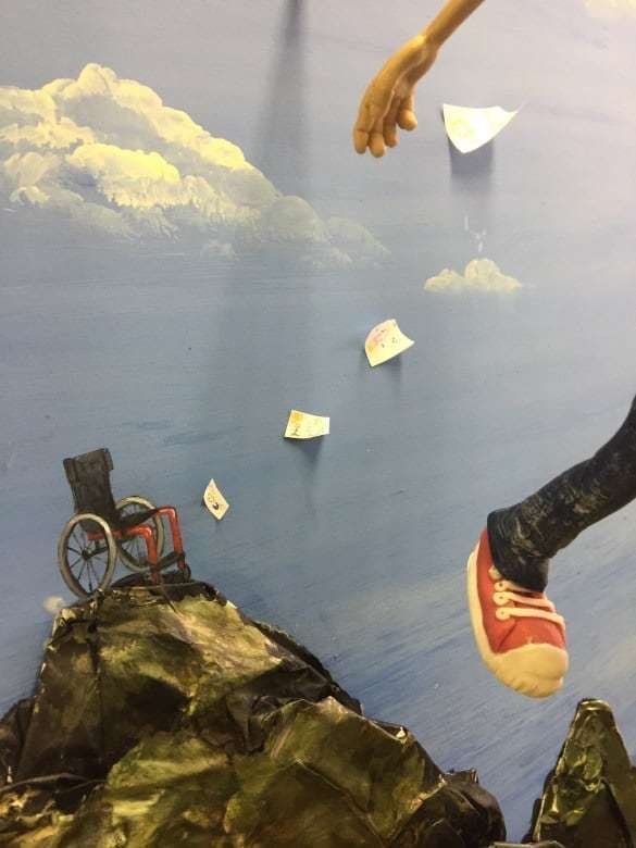 Original mixed media painting that celebrates resilience, individuality, and the boundless potential within us all. Inspired by Gerard, a young boy who embodies determination and self-confidence, this artwork depicts him overcoming hurdles, climbing mountains, and soaring away from his wheelchair toward a radiant future.