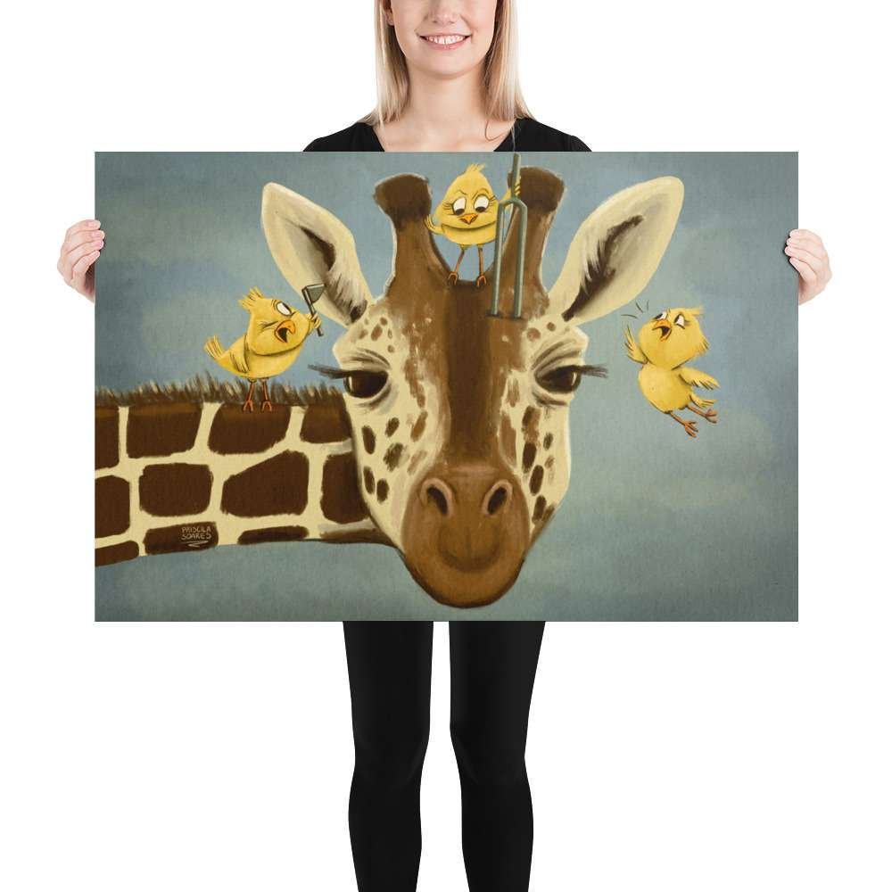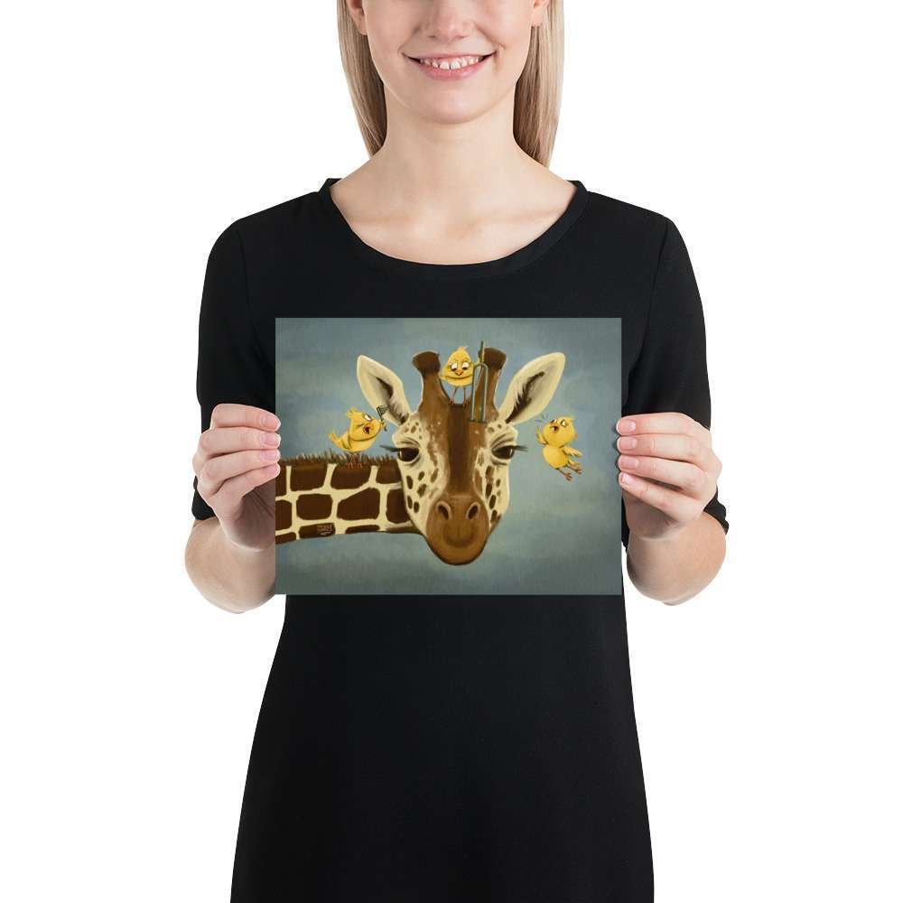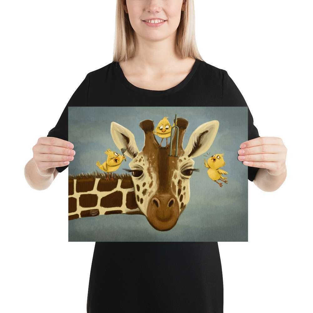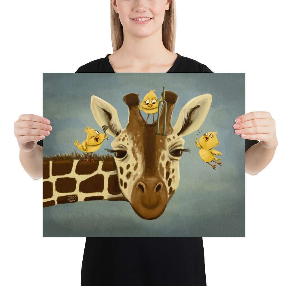 Bring a touch of whimsy to your space with “Tall Tales of Hearing,” a charming illustration of a giraffe getting its ears checked by three tiny birds. This delightful artwork playfully highlights the importance of hearing health while capturing the magic of nature and animal friendships.
