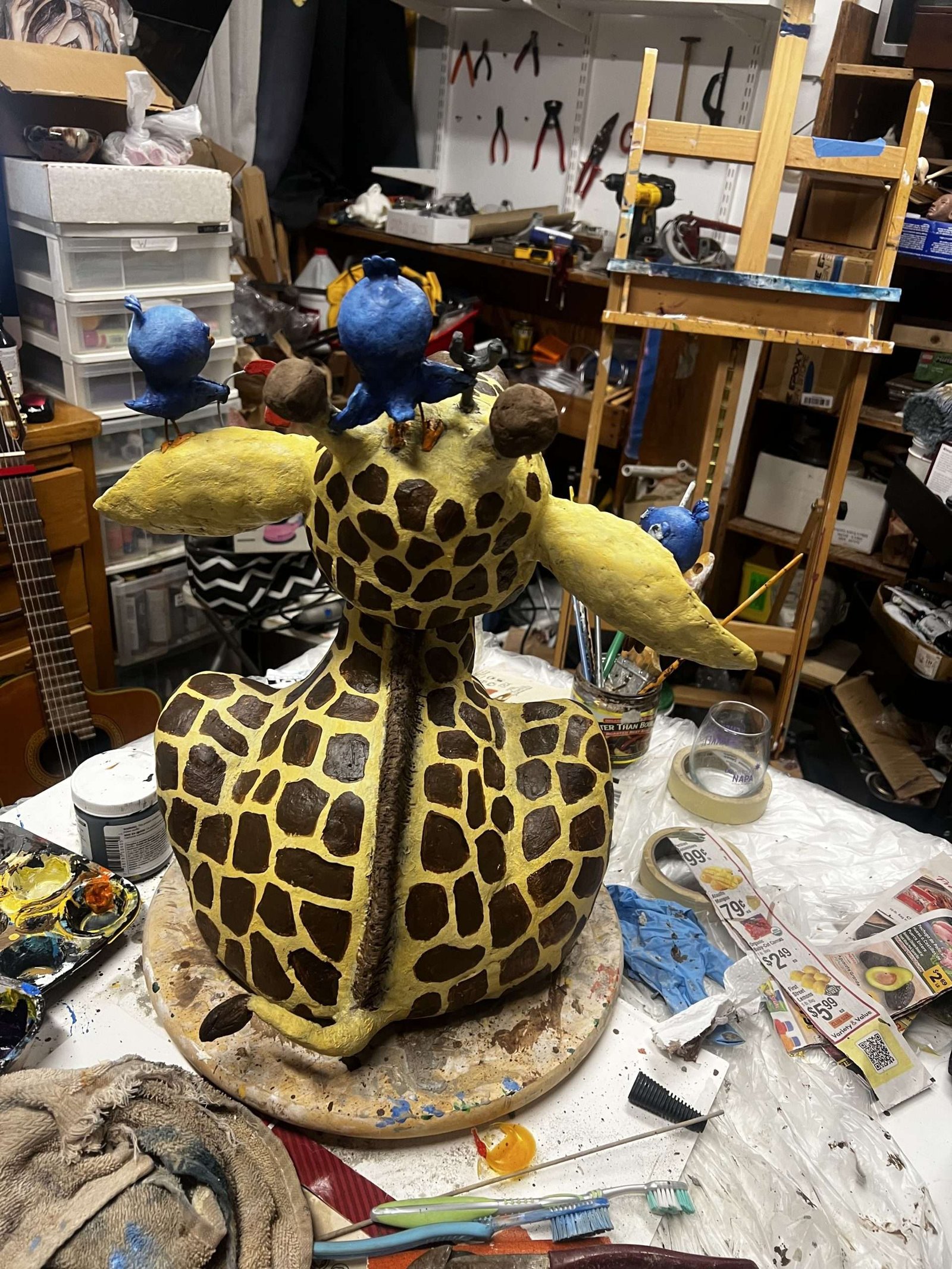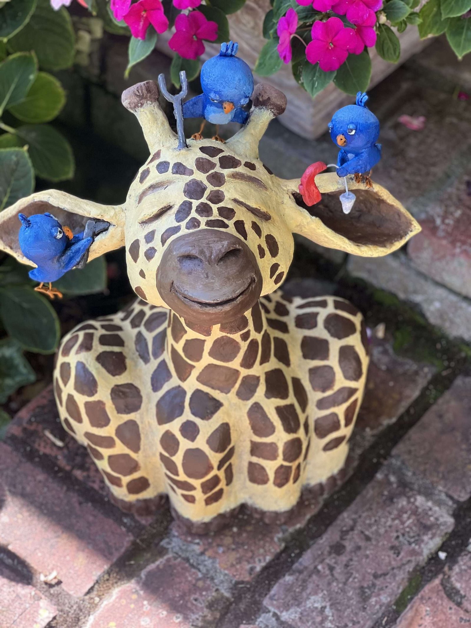 Bring a sense of whimsy and charm to your space with this cement paper mache sculpture, designed to delight and inspire. The scene features a gentle giraffe getting its ears checked by three playful little birds. One bird uses an otoscope, another a tuning fork, and the third carefully fits a hearing aid—a creative and heartfelt nod to hearing health.