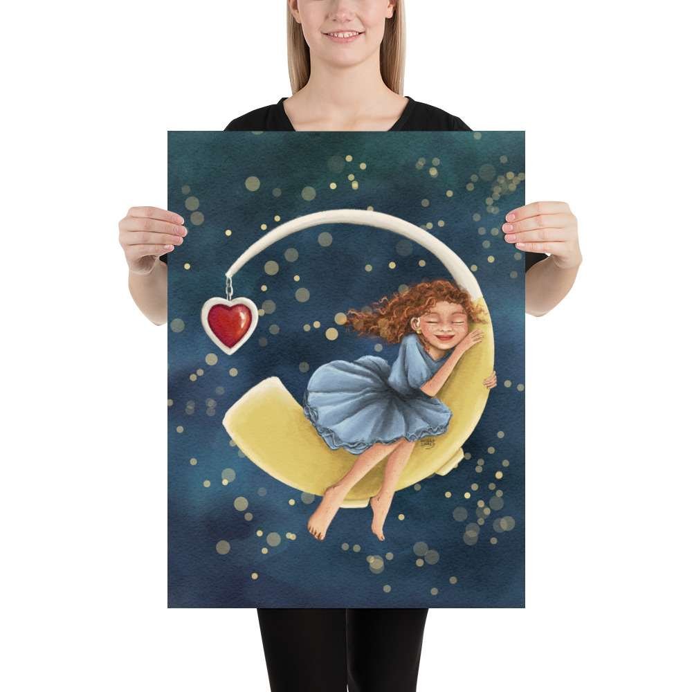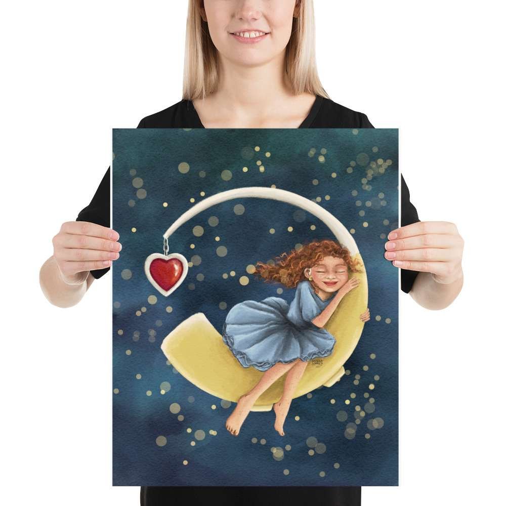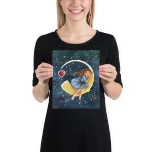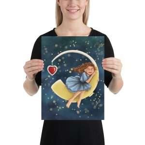 Celebrate the magic of self-expression with this enchanting print featuring a girl with a hearing aid, dressed in a flowing blue dress, gracefully seated on a crescent moon shaped like a hearing aid. This whimsical design captures the beauty of embracing one’s uniqueness while dreaming big under the night sky.