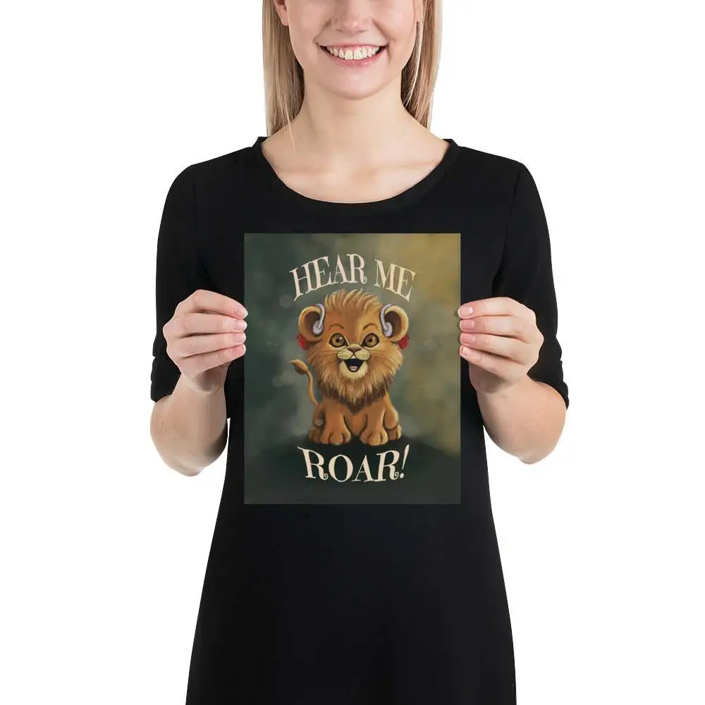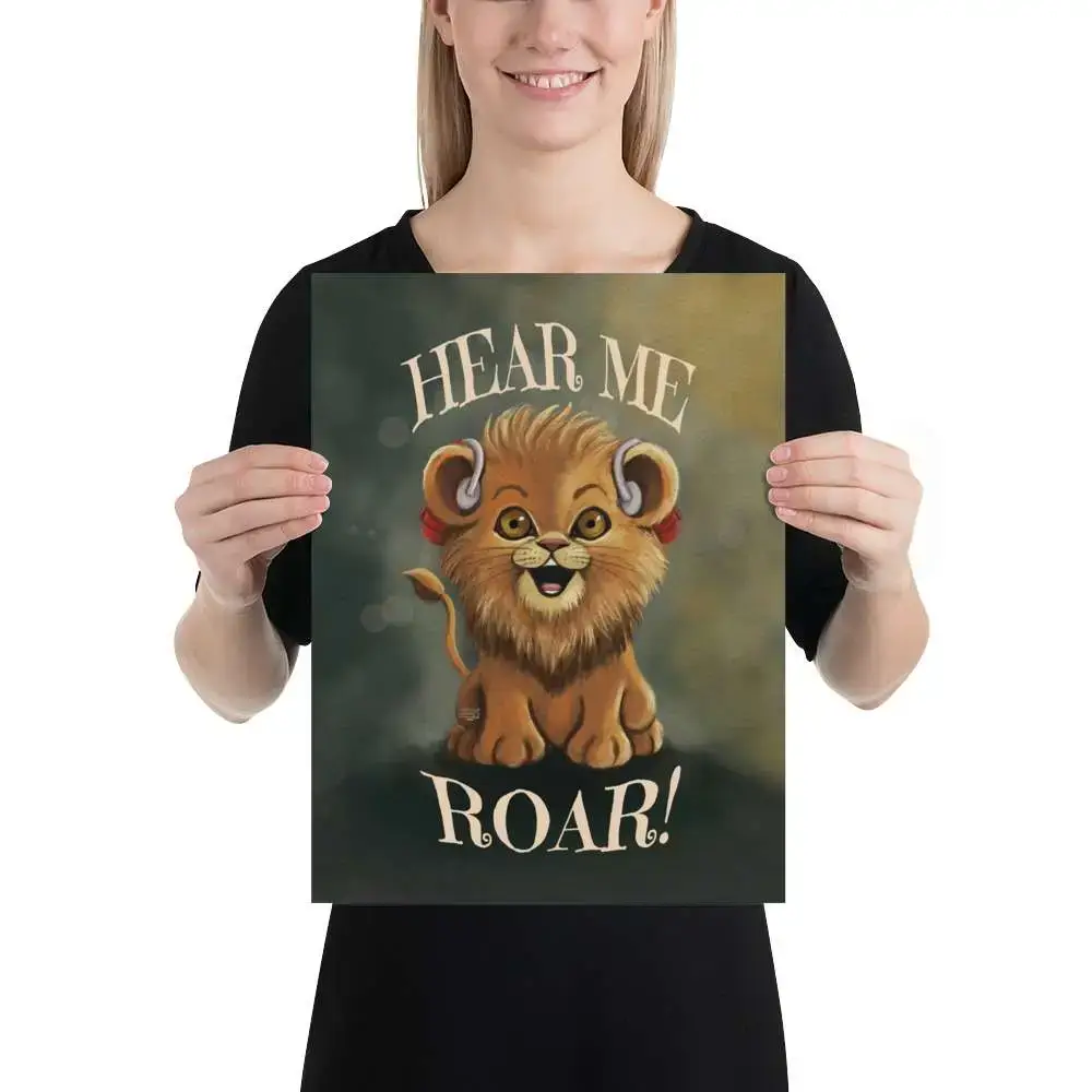 Experience the bold and inspiring energy of “Hear Me Roar” in its exclusive text edition. This striking illustration features a majestic lion not only proudly wearing hearing aids, but also showcasing the empowering “Hear Me Roar” message as a dynamic element of the art. Symbolizing strength, resilience, and hearing diversity, this art print is ideal for audiologists’ offices, hearing health advocates, or anyone looking to celebrate inclusive self-expression.