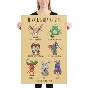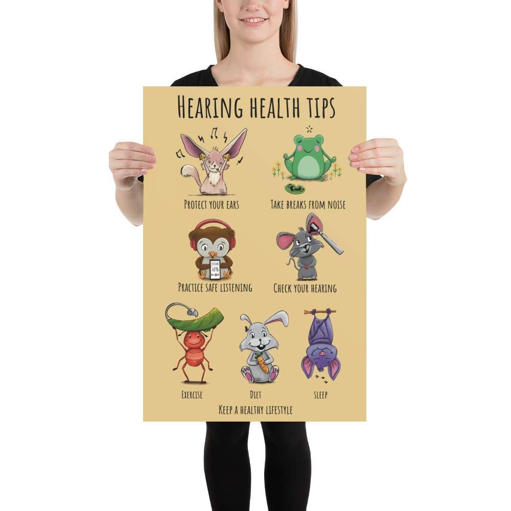 This playful and informative poster is designed to engage audiologists, ENT professionals, and educators while promoting hearing health awareness. Featuring adorable animals, each offering their own unique tip for taking care of your hearing, the poster serves as both a visual delight and an educational tool. From an owl wearing headphones to a frog meditating without cochlear implants, each character demonstrates a simple yet important message about hearing care. Whether it’s about using ear protection, taking breaks from loud sounds, or staying mindful of hearing devices, this poster provides practical tips with a fun, approachable twist. Perfect for clinics, classrooms, and offices, it reminds everyone that hearing health is something worth protecting—and it can be fun, too!