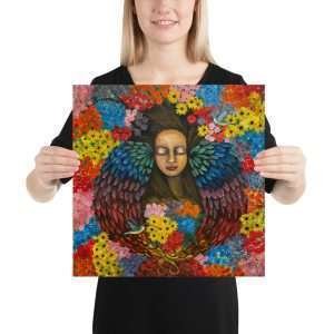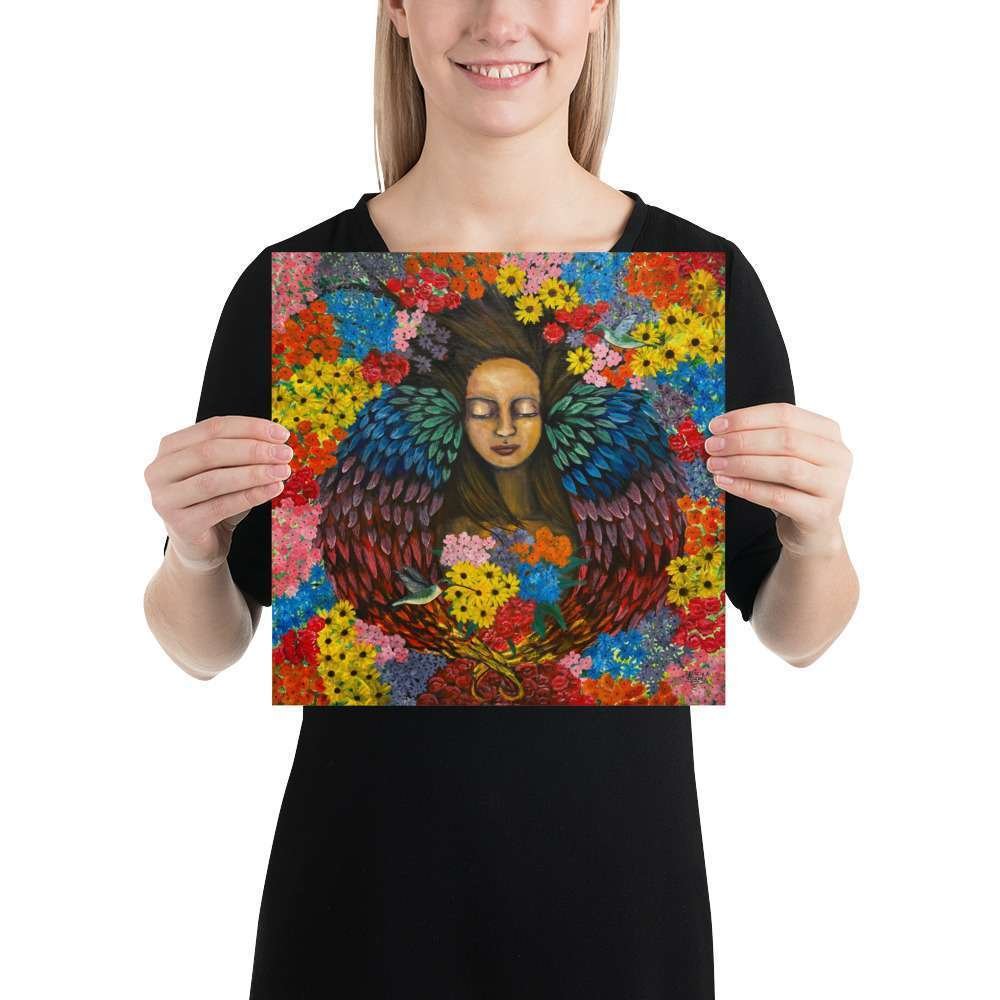 Nurturing Blossoms is a vibrant celebration of Spring’s beauty and renewal. This acrylic painting on wood features a woman surrounded by a blanket of colorful, nurturing flowers and delicate hummingbirds. Her radiant rainbow-colored wings, emerging from her ears, symbolize growth, transformation, and the joyful connection to nature’s energy. Perfect for bringing life and inspiration to any space, this artwork invites you to embrace the season of blooming possibilities.