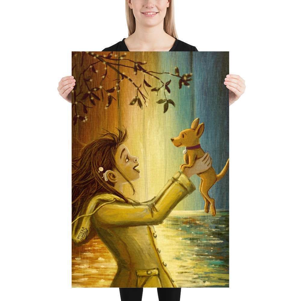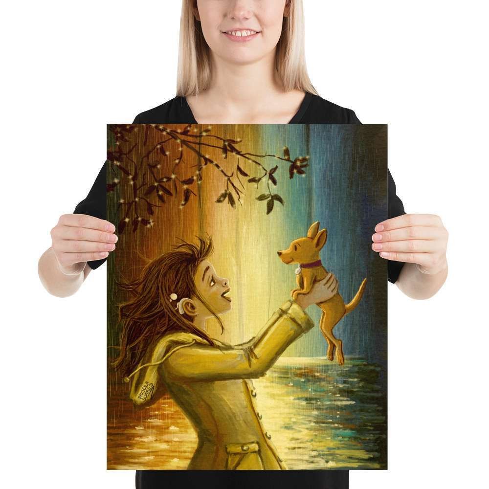 Celebrate the simple joys of life with this vibrant illustration of a heartwarming encounter between a woman wearing a cochlear implant and her little dog on a colorful rainy day. Splashes of bright colors and playful rain create a scene filled with energy, connection, and positivity, reminding us that even rainy days can bring moments of happiness.
