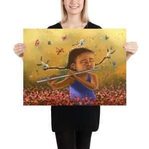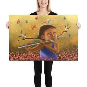 In a spring field adorned with vibrant blossoms, a young girl with hearing aids captivates the serene scene with her enchanting flute melodies. As she plays, a symphony of nature gathers around her – colorful birds flutter gracefully, butterflies dance in the gentle breeze, and curious bugs buzz with delight.