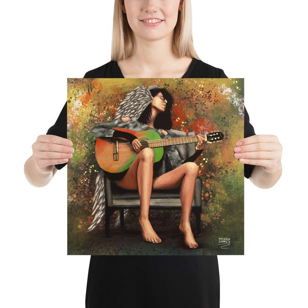 Playing the acoustic guitar makes the world around you disappear and you then go into a deep journey connected to the sounds of the strings. This painting is in celebration of these moments of solitude and inner connection.
