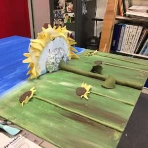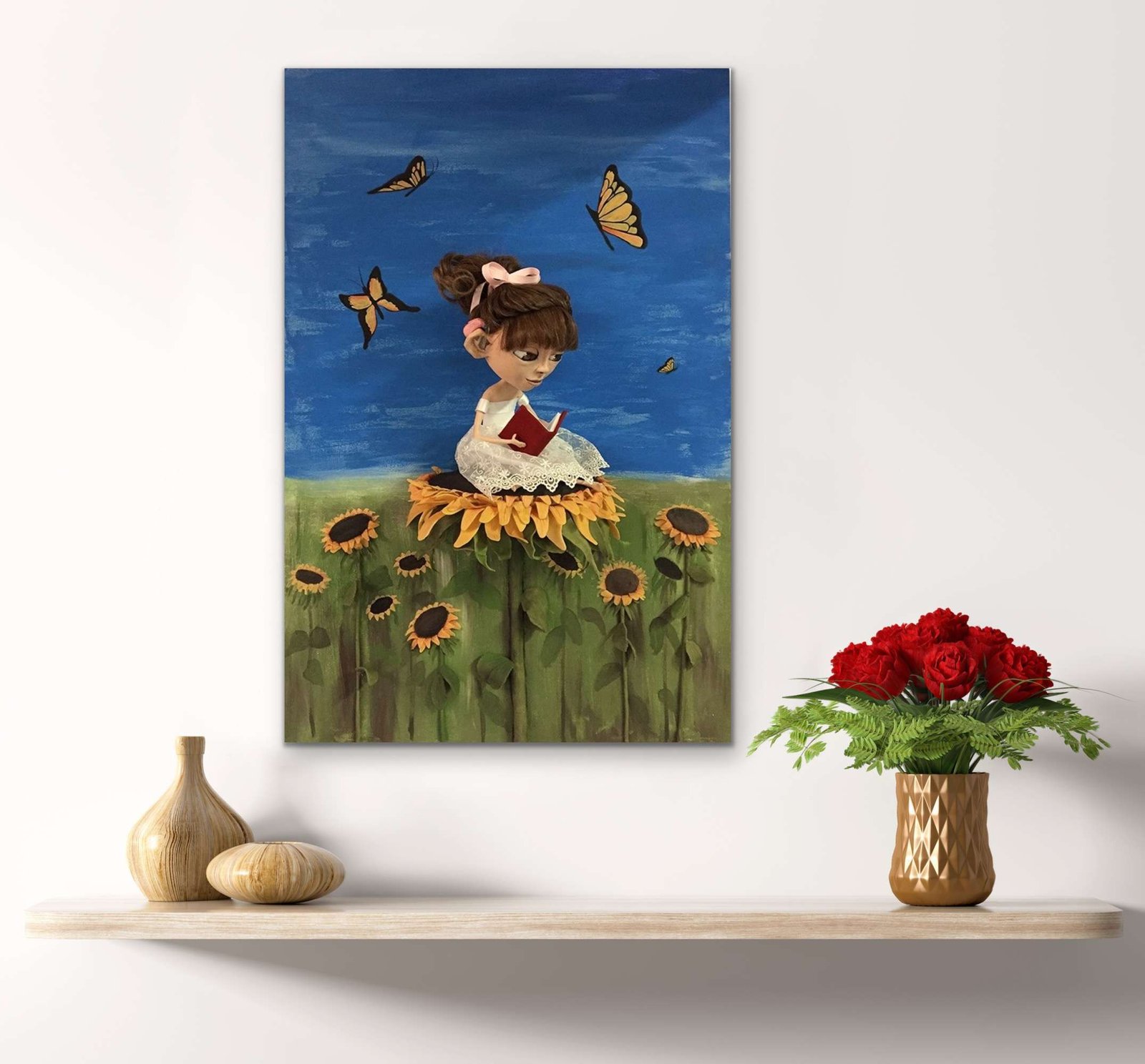 A heartfelt mixed media painting that celebrates the resilience, joy, and light embodied by Clara, a little girl whose remarkable journey inspires many. This piece depicts a doll-like Clara, wearing her hearing aids, sitting atop a vibrant sunflower in a vast sunflower field. The sunflower, symbolizing strength, positivity, and unwavering growth, serves as a tribute to Clara’s incredible spirit and her family’s enduring love.