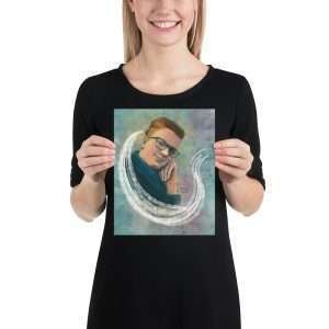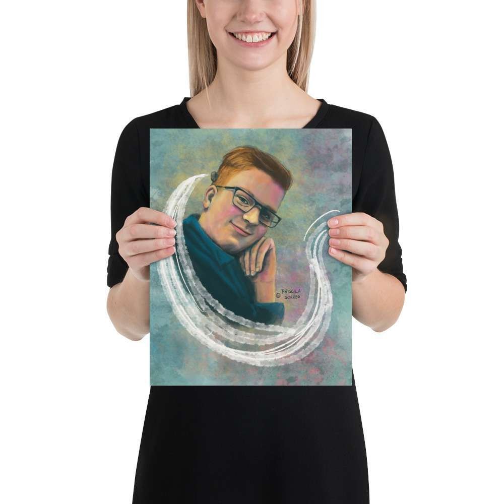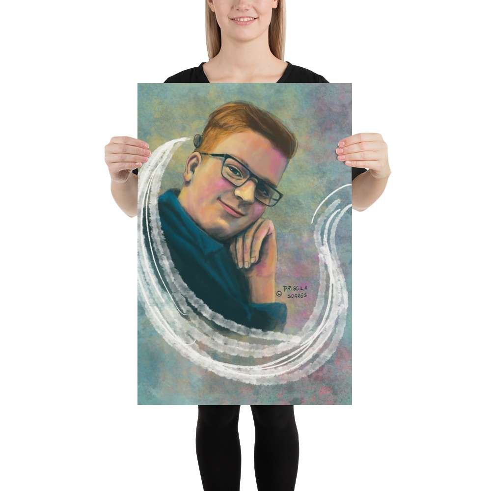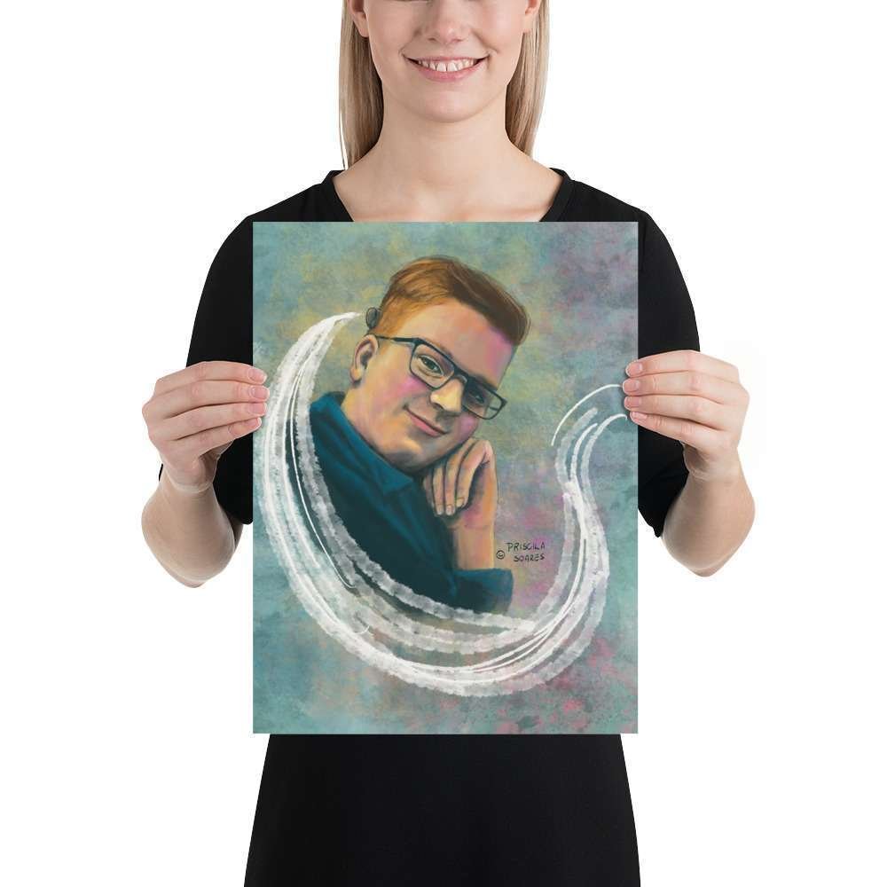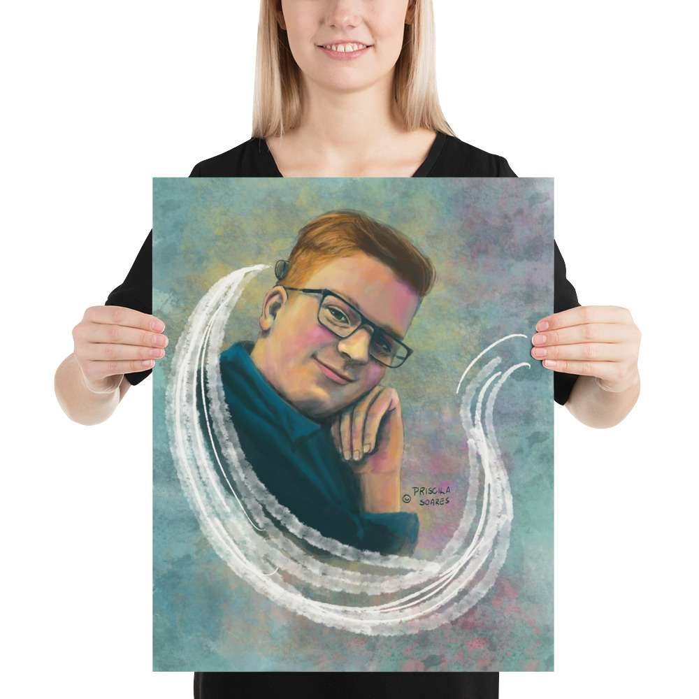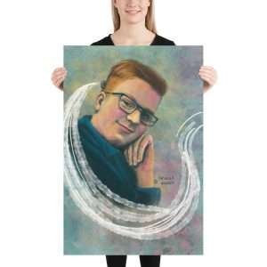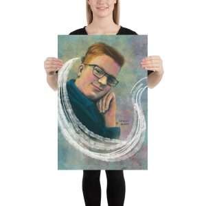 Misty tells the story of her 14 year old son, Holden. Like me, he has a condition called cholesteatoma and even though he’s had many surgeries and some hard times, he shows up as a caring advocate of others. Holden’s story had a lot of parts that I could relate to and I hope you will be inspired by this compassionate young man. I wanted to capture Holden’s true heart in this painting. In my opinion, this pose gives us a sense of calm but at the same time, he seems to be paying attention to us, listening! At last, I wanted to show how his Bone Anchored Hearing Aids (BAHAs) now give him access to new sounds he’s finally able to hear.