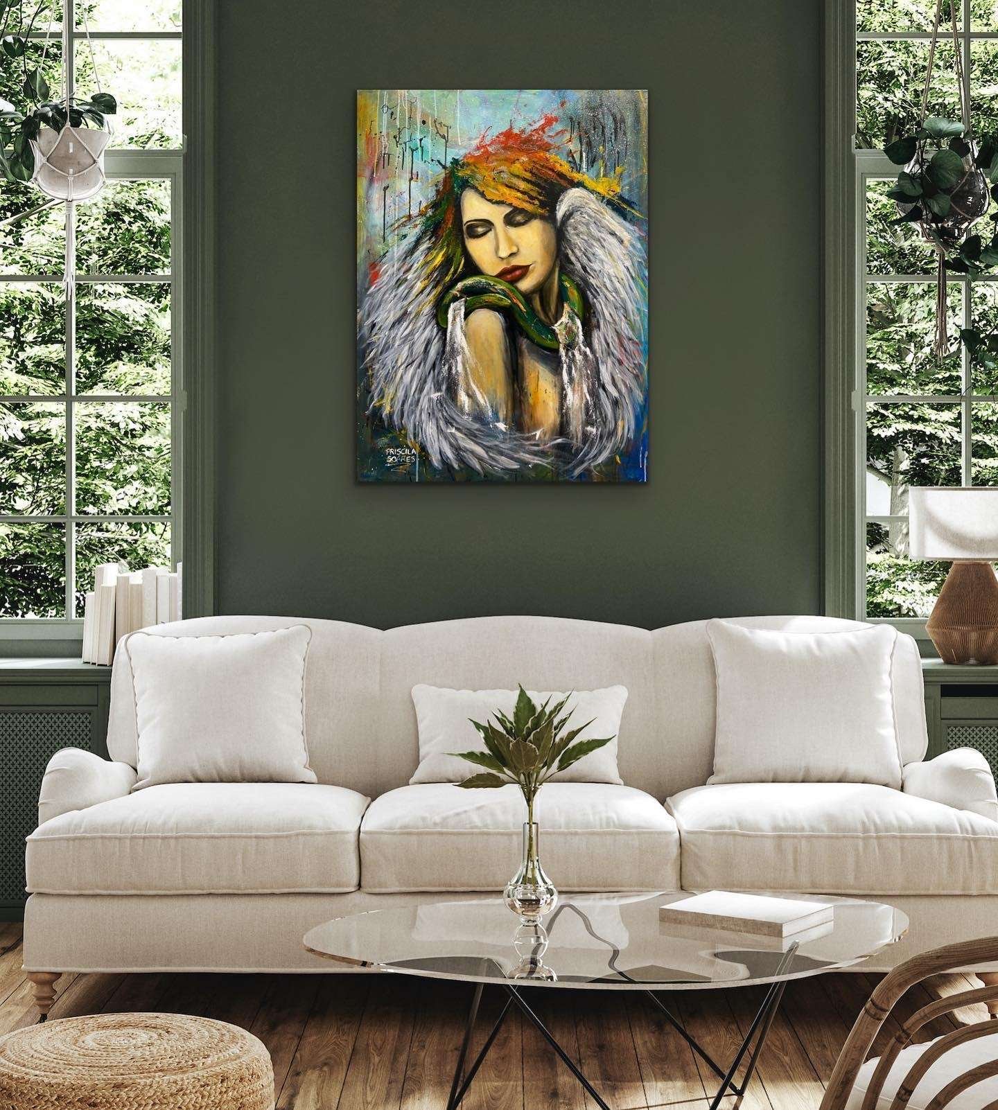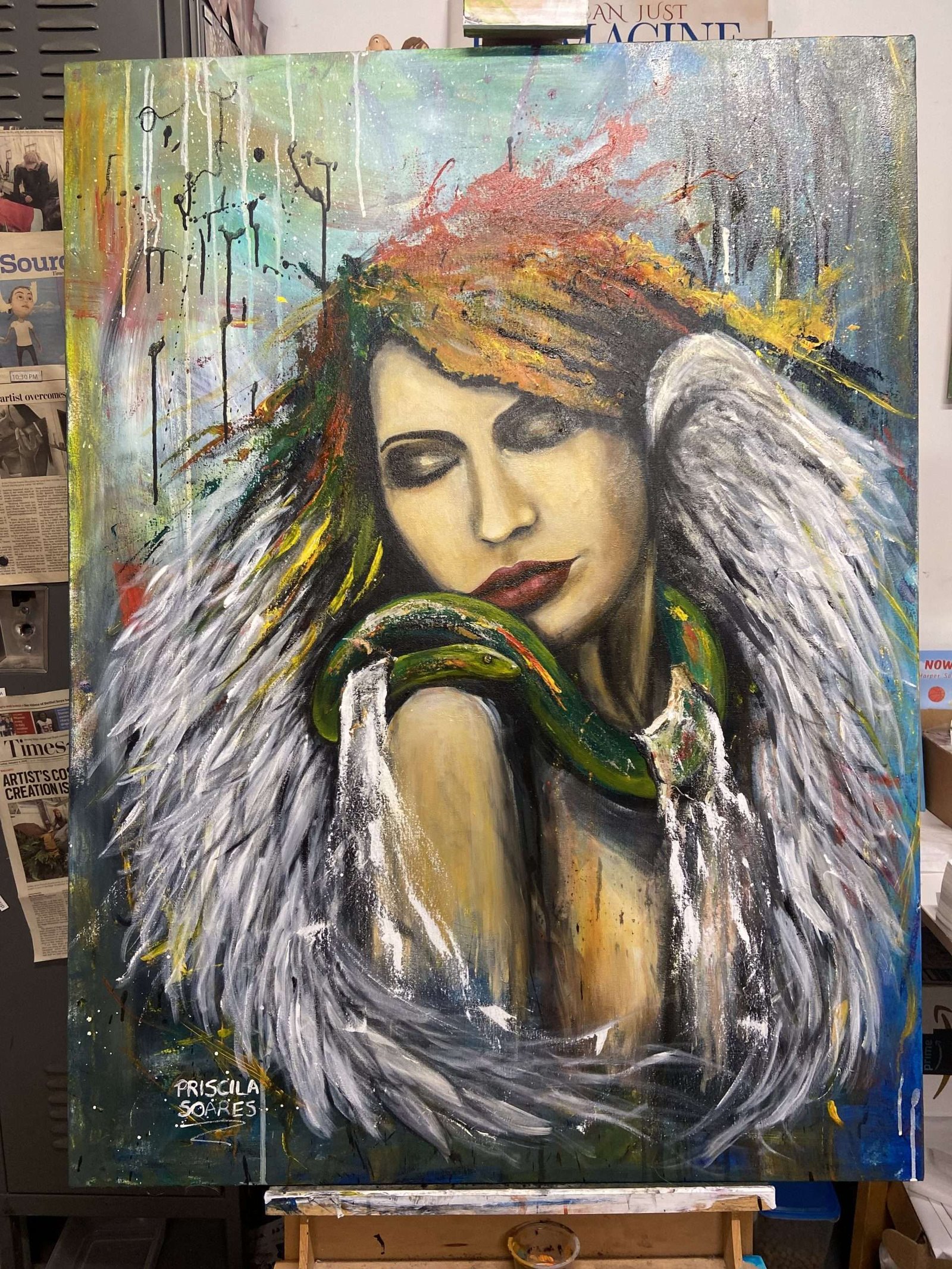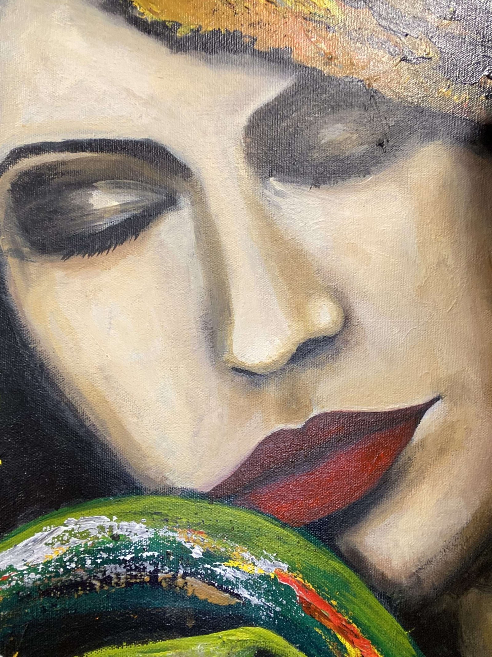 The Snake is a deeply personal acrylic and oil painting on canvas that embodies transformation and renewal. This striking portrait symbolizes the shedding of old layers to reveal a truer self, capturing a pivotal moment of re-evaluation and growth. Created during a time of introspection, the artwork reflects a desire for balance, healthier choices, and clarity about life’s direction.
