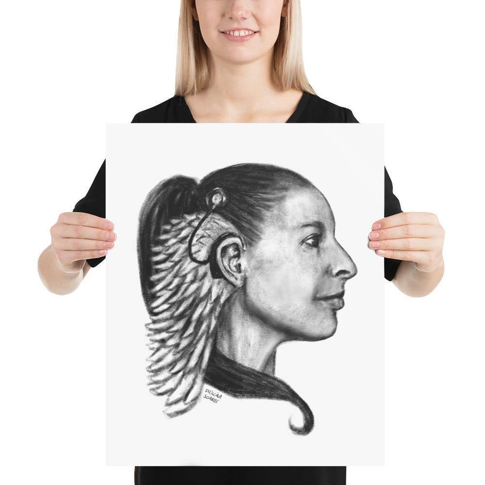 Melissa wears a cochlear implant on her right side (seen on painting), and a hearing aid on her left side. I loved a couple of her black and white photos she has shared with me and thought that this would be the perfect opportunity to paint with my digital charcoal brushes. It’s one of my favorite mediums! It was hard to pick which side of her face I wanted to portray, but I decided that her cochlear side with the wing would be a wonderful match with this medium and to her story.