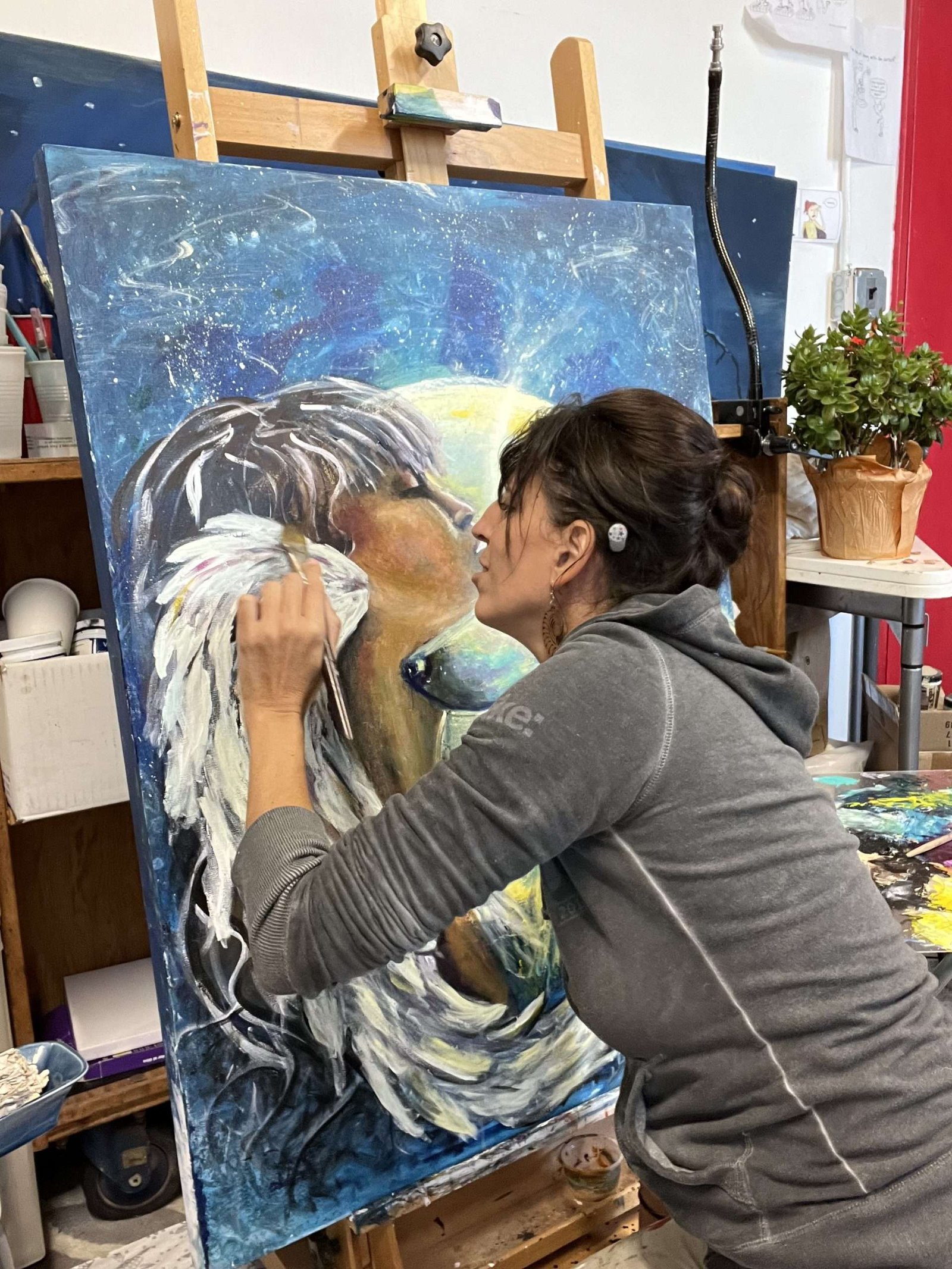 In this artwork, the energy of breath flows seamlessly between the woman and the interconnected web of life surrounding her. Her wing transforms into a blooming flower, symbolizing renewal and the nectar of life. This mesmerizing piece invites you to embrace the wolf’s wisdom, empowering your spirit with resilience and vitality.