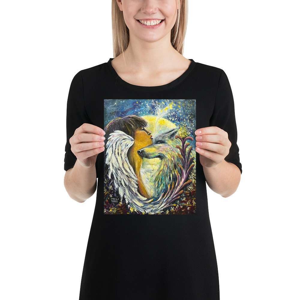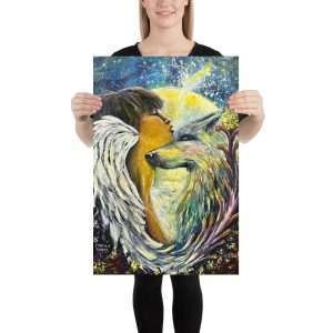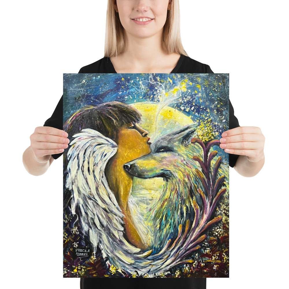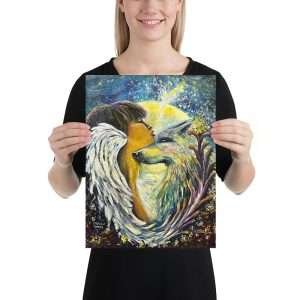 In this artwork, the energy of breath flows seamlessly between the woman and the interconnected web of life surrounding her. Her wing transforms into a blooming flower, symbolizing renewal and the nectar of life. This mesmerizing piece invites you to embrace the wolf’s wisdom, empowering your spirit with resilience and vitality.